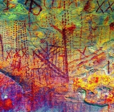 "Yellow Panel": Located on a detached rock, displaying similar finger-marked techniques with some darker red-orange hues, possibly due to ochre decay. Superimposition is evident, suggesting a "sequence of production over time." A labyrinth-like geometric figure is a notable motif.